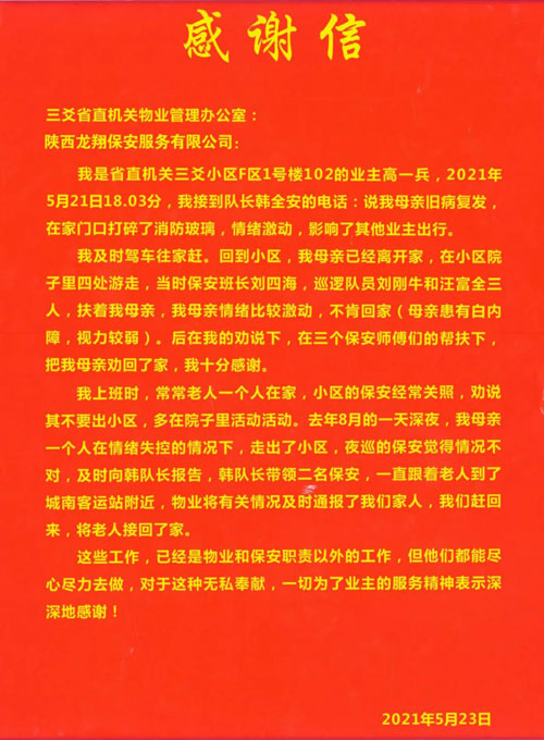 近日,三爻小區(qū)業(yè)主高一兵為保安送來了感謝信,以感謝他平時不在家時,保安對他母親的幫助和照顧。