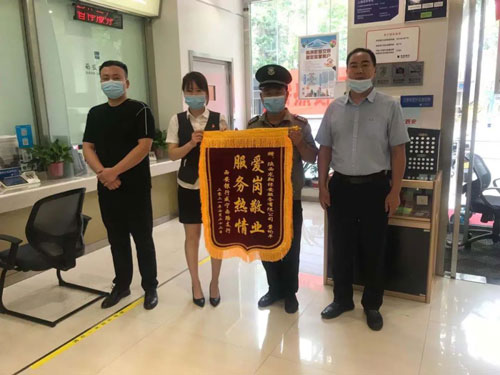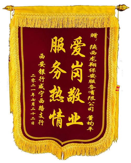 7月22日,西安銀行咸寧西路支行為我公司駐行保安董均平送來“愛崗敬業(yè),熱情服務”的錦旗。