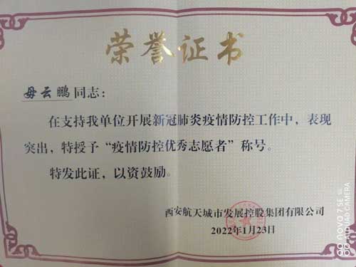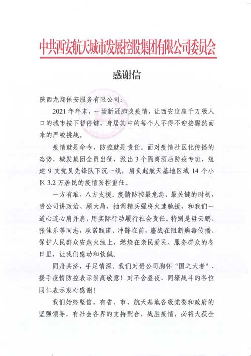 近期,龍翔保安收到一封來自中共西安航天城發(fā)展控股集團(tuán)有限公司委員會的感謝信,信中充分肯定了我公司保安員毋云鵬、張佳樂等同志在疫情防控期間認(rèn)真負(fù)責(zé)、勤懇務(wù)實(shí)的工作態(tài)度。
