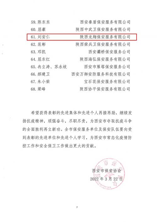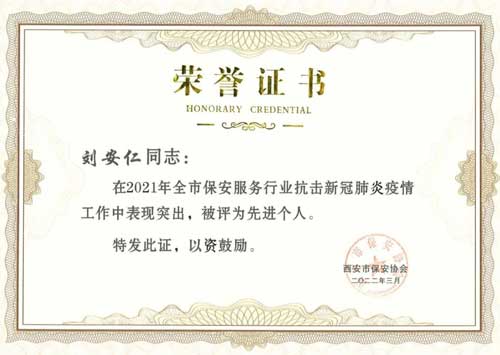 近日,西安市保安協(xié)會發(fā)布了關于對在2021年抗擊新冠肺炎疫情工作中表現(xiàn)突出的先進集體和先進個人的表彰決定,授予龍翔保安劉安仁同志“2021年全市保安服務行業(yè)抗擊新冠肺炎疫情工作表現(xiàn)突出先進個人”榮譽證書。