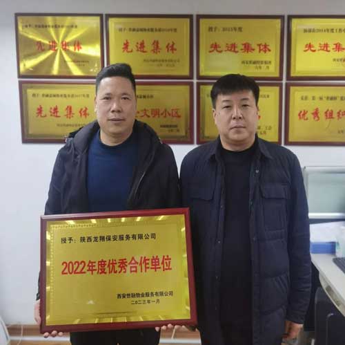 近日,龍翔保安被西安世融物業(yè)服務(wù)有限公司評(píng)為“2022年度優(yōu)秀合作單位”,這份榮譽(yù)是對(duì)我公司駐世融嘉城項(xiàng)目全體保安人員2022年度工作的認(rèn)可,也是對(duì)我公司保安管理工作的肯定。